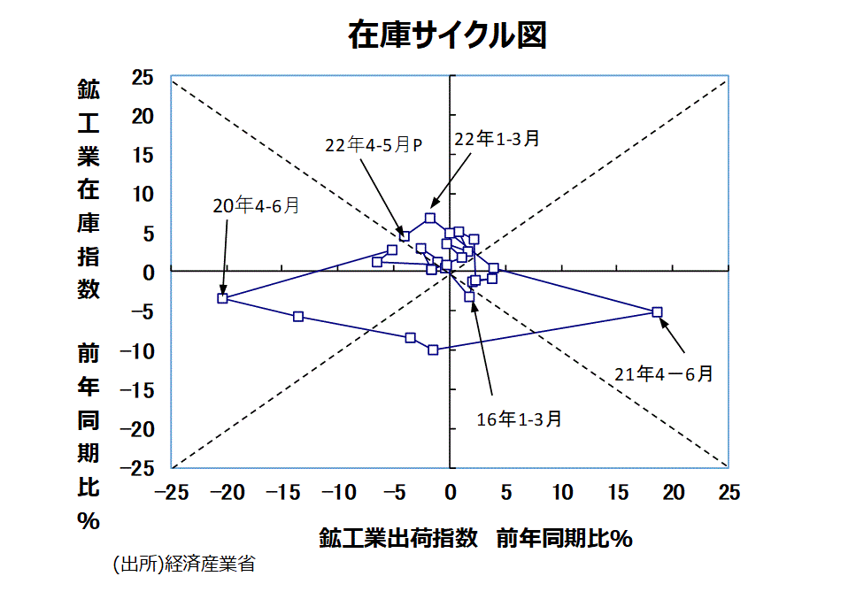 ●鉱工業全体の在庫循環の動きをチェックするために、縦軸に鉱工業在庫指数・前年比、横軸に鉱工業出荷指数・前年比をとった在庫サイクル図をつくると、20年10~12月期、21年1~3月期では「意図せざる在庫減局面」になっていた。4~6月期では「在庫積み増し局面」に入った。7~9月期では引き続き「在庫積み増し局面」となった。10~12月分では在庫が前年同期比+4.9%、出荷が前年同月比0.0%の伸び率になり、「在庫積み上がり局面」となった。22年1~3月期では在庫が前年同期比+6.8%、出荷が前年同期比▲1.8%の伸び率で引き続き「在庫積み上がり局面」となっていた。今回4~5月分では在庫が前年比+4.6%、出荷が前年比▲4.0%の伸び率で、「在庫積み上がり局面」継続となった。なお、部材調達不足などによる生産の減少による影響が含まれていることなどを考慮することが必要な局面であろう。