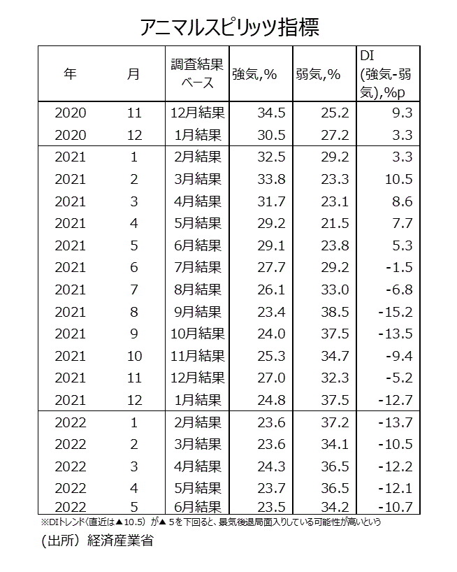 ●経済産業省は製造工業生産予測指数からアニマルスピリッツ指標を作成している。21年6月調査結果で、アニマルスピリッツ指標(生産活動マインド指標:DI)は10カ月連続のプラスの数値となり、企業の生産マインドは強気超の状況が続いていたが、21年7月~22年6月調査結果ではDIは12カ月連続のマイナスになっている。22年6月調査結果のDIは▲10.7である。22年5月調査結果のDI▲12.1からマイナス幅が縮小した。