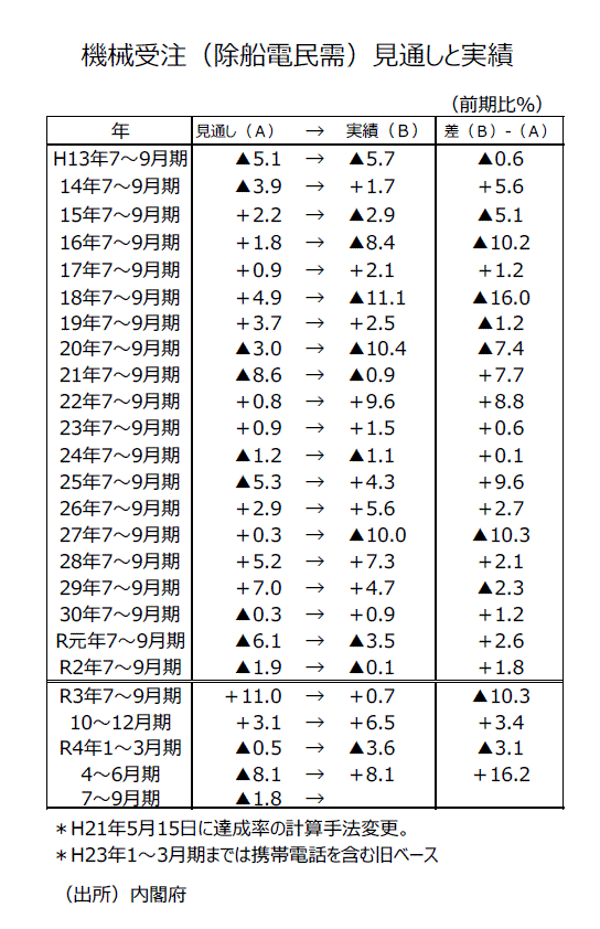 ●機械受注(除船電民需)4~6月期の前期比見通しは▲8.1%であった。ウクライナ情勢等の影響を受けた原材料高に加え、新型コロナウイルスの感染拡大を受けた上海のロックダウンなどから企業が先行きの設備投資に慎重になったことが背景とみられた。しかし、実績は前期比+8.1%と事前予想よりもかなりしっかりした内容になった。