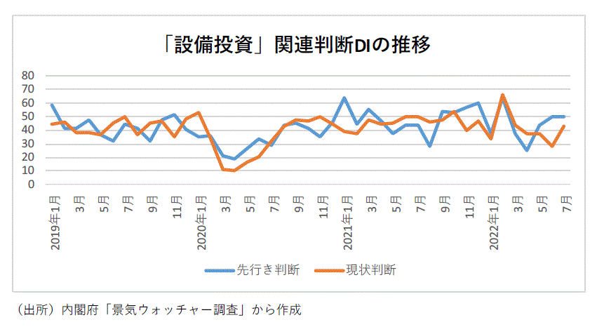 ●一方、設備投資関連・先行き判断DIは21年11月57.1(回答した景気ウォッチャー・7人)、12月60.0(同5人)と4カ月連続の50超になった。その後、22年1月37.5(同8人)、2月は66.7(同3人)、3月は37.5(同6人)、4月25.0(同2人)、5月43.8(同8人)、6月50.0(同6人)、7月50.0(同3人)と推移している。7月では「新型コロナウイルス感染拡大の第7波と客先業界が全体的に低迷していることもあり、設備投資への意欲はかなり低くなってきているが、年末にかけてはある程度高まってくると考えられるため、若干の期待は持っている。(東海:電気機械器具製造業(経営者))」というコメントがあった。