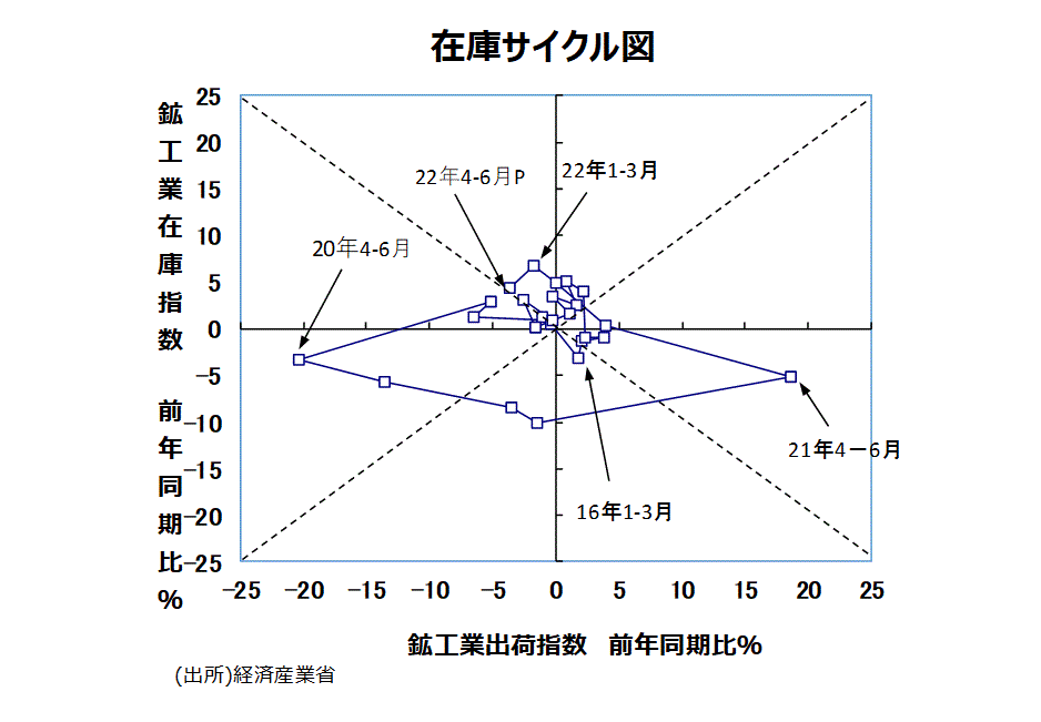 ●鉱工業全体の在庫循環の動きをチェックするために、縦軸に鉱工業在庫指数・前年比、横軸に鉱工業出荷指数・前年比をとった在庫サイクル図をつくると、20年10~12月期、21年1~3月期では「意図せざる在庫減局面」に、4~6月期、7~9月期では「在庫積み増し局面」だった。10~12月分では在庫が前年同期比+4.9%、出荷が前年同月比0.0%の伸び率になり、「在庫積み上がり局面」となった。22年1~3月期では在庫が前年同期比+6.8%、出荷が前年同期比▲1.8%の伸び率で引き続き「在庫積み上がり局面」となっていた。今回4~6月期では在庫が前年同月比+4.4%、出荷が前年同月比▲3.7%で、「在庫積み上がり局面」継続となった。なお、部材調達不足などによる生産の減少による影響が含まれていることなどを考慮することが必要な局面であろう。