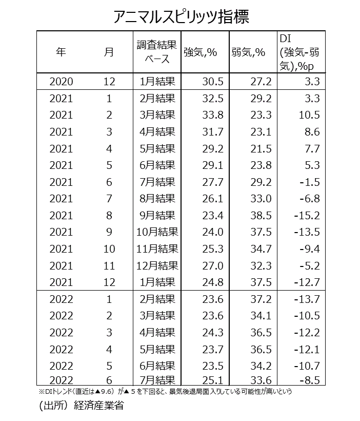 ●経済産業省は製造工業生産予測指数からアニマルスピリッツ指標を作成している。21年6月調査結果で、アニマルスピリッツ指標(生産活動マインド指標:DI)は10カ月連続のプラスの数値となり、企業の生産マインドは強気超の状況が続いていたが、21年7月~22年7月調査結果ではDIは13カ月連続のマイナスになっている。22年7月調査結果のDIは▲8.5である。22年6月調査結果のDI▲10.7からマイナス幅が縮小した。