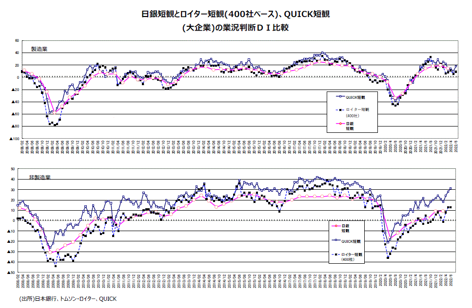 ●6月調査日銀短観では、大企業・製造業・業況判断DIが+9と3月調査の+14から悪化した。6月調査の調査期間は5月30日から6月30日である。ロシアのウクライナ侵攻の影響で原材料価格が高騰したことや、中国のロックダウンなどが影響したようだ。
