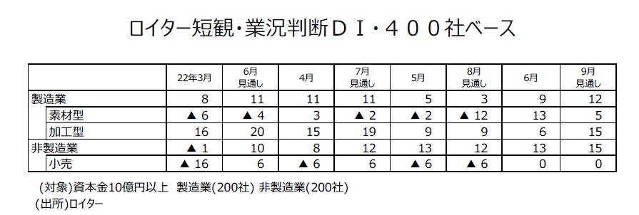 ●6月15日に発表されたロイター短観6月調査の調査期間は6月1日から6月10日である。6月調査400社ベースの製造業の業況判断DIは3月調査の+8から1ポイント上昇し+9になった。また、6月調査200社ベースの製造業の業況判断DIは3月調査の+15から1ポイント低下し+14になった。