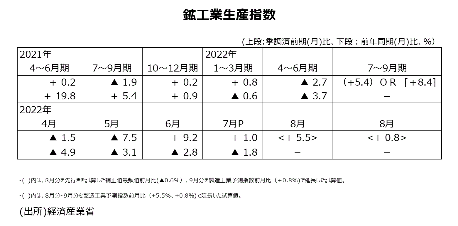 ●鉱工業生産指数・7月分速報値・前月比は、部品供給不足の影響が緩和したことなどから自動車工業等が上昇し、全体で+1.0%と2カ月連続上昇した。季節調整値の水準は97.1で、21年7月の98.1以来の水準だ。前年同月比は▲1.8%で5カ月連続の低下である。