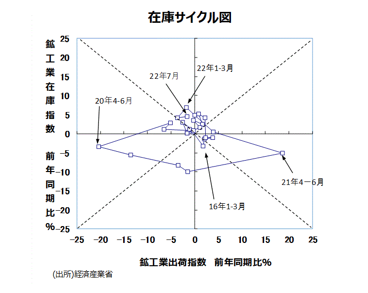 ●鉱工業全体の在庫循環の動きをチェックするために、縦軸に鉱工業在庫指数・前年比、横軸に鉱工業出荷指数・前年比をとった在庫サイクル図をつくると、20年10~12月期、21年1~3月期では「意図せざる在庫減局面」に、4~6月期、7~9月期では「在庫積み増し局面」だった。10~12月分では在庫が前年同期比+4.9%、出荷が前年同月比0.0%の伸び率になり、「在庫積み上がり局面」となった。22年1~3月期では在庫が前年同期比+6.8%、出荷が前年同期比▲1.8%の伸び率で引き続き「在庫積み上がり局面」継続。4~6月期も、在庫が前年同月比+4.2%、出荷が前年同月比▲3.6%で、「在庫積み上がり局面」継続となった。今回7月分・速報値でも、在庫が前年同月比+4.5%、出荷が前年同月比▲1.6%で、「在庫積み上がり局面」継続となった。