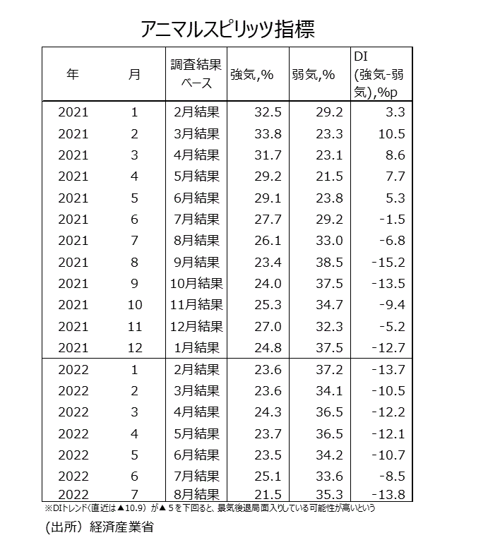 ●経済産業省は製造工業生産予測指数からアニマルスピリッツ指標を作成している。21年6月調査結果で、アニマルスピリッツ指標(生産活動マインド指標:DI)は10カ月連続のプラスの数値となり、企業の生産マインドは強気超の状況が続いていたが、21年7月~22年8月調査結果ではDIは14カ月連続のマイナスになっている。22年8月調査結果のDIは▲13.8である。22年7月調査結果のDI▲8.5からマイナス幅が拡大した。