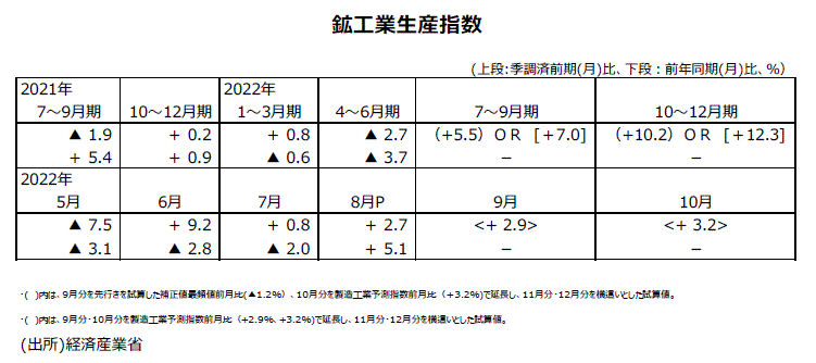 ●経済産業省の基調判断は21年11月分から22年3月分まで、「生産は持ち直しの動きがみられる」になっていたが、22年4月分で「生産は足踏みをしている」に下方修正され、5月分では「生産は弱含んでいる」に連続して下方修正されていた。6月分で、「生産は一進一退で推移している」に上方修正され、前回7月分でも、「生産は一進一退で推移している」の判断は継続であった。今回8月分では、「生産は緩やかな持ち直しの動き」に上方修正された。