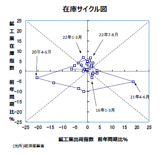 ●鉱工業全体の在庫循環の動きをチェックするために、縦軸に鉱工業在庫指数・前年比、横軸に鉱工業出荷指数・前年比をとった在庫サイクル図をつくると、20年10~12月期、21年1~3月期では「意図せざる在庫減局面」に、4~6月期、7~9月期では「在庫積み増し局面」だった。10~12月分では、「在庫積み上がり局面」となった。22年1~3月期では在庫が前年同期比+6.8%、出荷が前年同期比▲1.8%の伸び率で引き続き「在庫積み上がり局面」継続。4~6月期も、在庫が前年同月比+4.2%、出荷が前年同月比▲3.6%で、「在庫積み上がり局面」継続となった。7~8月分・速報値でも、在庫が前年同月比+6.6%、出荷が前年同月比+1.2%で、「在庫積み上がり局面」継続となった。
