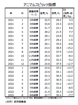 ●経済産業省は製造工業生産予測指数からアニマルスピリッツ指標を作成している。21年6月調査結果で、アニマルスピリッツ指標(生産活動マインド指標:DI)は10カ月連続のプラスの数値となり、企業の生産マインドは強気超の状況が続いていたが、21年7月~22年9月調査結果ではDIは15カ月連続のマイナスになっている。22年9月調査結果のDIは▲7.7である。22年8月調査結果のDI▲13.8からマイナス幅が縮小した。