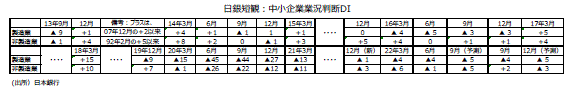 ●中小企業・製造業の「先行き」の業況判断は▲5と「最近」▲4から1ポイント悪化する見通しである。また、中小企業・非製造業は「先行き」を慎重にみる傾向があり、▲3と「最近」+2から5ポイント悪化する見通しである。