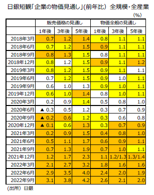 ―企業の物価見通し、全規模・全産業6項目全てで、初の4調査連続・上昇率アップ―