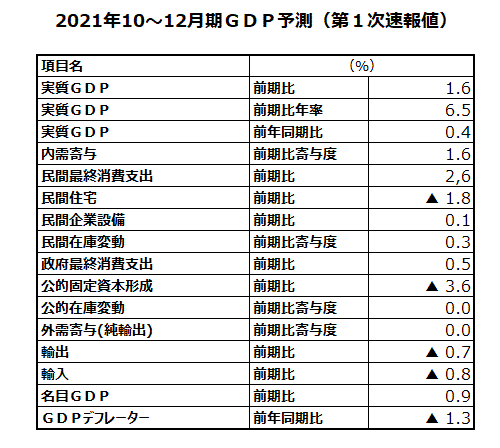 2021年10~12月期実質GDP(第1次速報値)予測