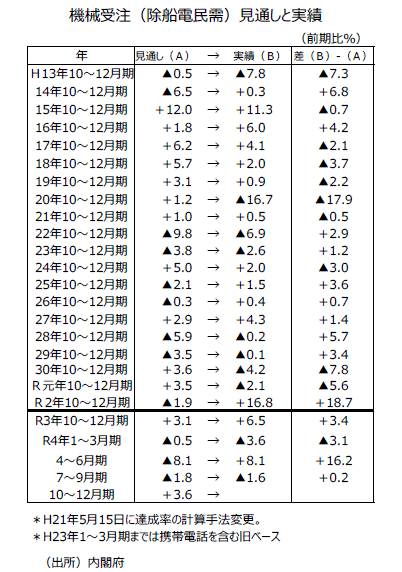 ●機械受注(除船電民需)10~12月期の前期比見通しは+3.6%である。10~12月期の前期比実績は09年(平成21年)から21年までの13年間でみると、上振れ9回、下振れ4回であり、上振れしやすい傾向がある四半期と言える。ただ、22年(令和4年)10~12月期の見通しは単純集計値に過去3四半期平均の達成率100.3%をかけたものであり、見通しの算出に使った達成率が100%より高い。DX投資などの今やるべき投資がある局面であるが、先行き不透明な環境は設備投資に厳しいものがあり、今年の10~12月期実績は下振れる可能性が大きくなったと思われる。