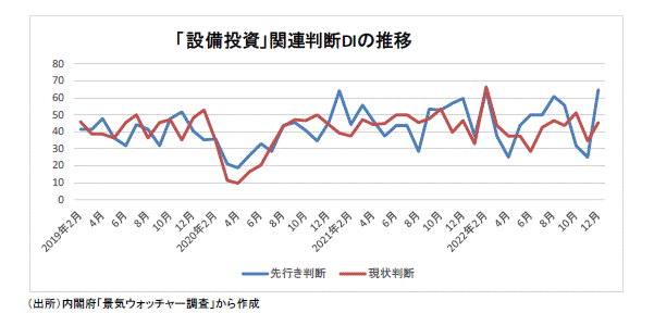 ●景気ウォッチャー調査の設備投資関連・現状判断DIは、22年3月43.8(同8人)、4月37.5(同4人)、5月37.5(同6人)、6月28.6(同7人)、7月42.9(同7人)、8月46.9(同8人)、9月43.8(同4人)、10月51.1(同7人)、11月35.0(同5人)、12月45.8(同6人)と推移している。12月では「客先の設備投資の話題が少なく、3カ月前と比べても見積りの件数が少ない。(東北:一般機械器具製造業(経営者))」というコメントがあった。