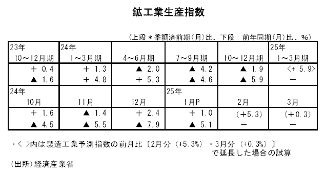 鉱工業生産指数・1 月分速報値は前月比+1.0%と、2 カ月連続の増加になった。1 月分の生産の増加に寄与した業種は輸送機械工業、鉄鋼業等であった。エコカー補助金終了に対応した大幅減産を9 月に実施したあと10 月分増加・11 月分減少とジグザグの動きをしていた輸送機械工業は12 月分で前月比は+6.8%、1 月分で同+6.8%と増加した。国内や欧州、アジア向けの普通自動車の生産が伸び、自動車部品も増えた。円安の進展など環境変化も支援材料となりしっかりした増加基調に戻った。鉄鋼業は12 月分前月比+2.0%の後、1 月分で同+6.6%と2 カ月連続増加した。国内の建材やインド、マレーシア向けで増産されたようだ。製造工業生産予測調査によると、2 月は前月比+5.3%の増加、3 月は同+0.3%の増加と先行きは4 カ月連続で前月比増加基調継続の見込みだ。生産動向がしっかりしていることを示唆していよう。今回の調査で予測修正率が11 カ月ぶりにプラスに転じたことは明るい材料だ。先行きの鉱工業生産指数を2 月・3 月の予測指数の前月比で延長すると、1~3 月期の鉱工業生産指数・前期比は+5.9%と4 四半期ぶりの増加になる。