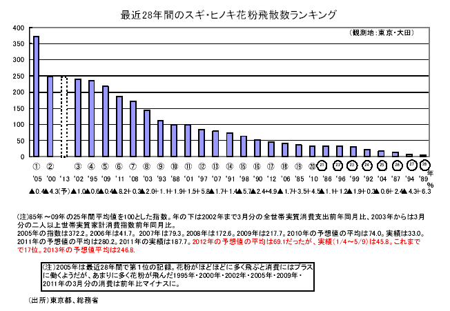 昨年10 月7 日から6 週連続「笑点」が「その他娯楽番組」で最高視聴率になったことは昨秋の景況感の悪さを示した。12 月・1 月は1 位回避の週がほとんどで景況感改善を示唆していた。但し2 月は全ての週で1位になったことが気懸かりだ。円安や寒さで灯油が2008 年以来の高値になったことなどで、節約の動きが出ている可能性もあろう。中央競馬売上高の2 月24 日までの年初からの累計前年比は1.9%減である。1月は増加であったが2月は後半になると減少に転じている。政府の要請に応えて賃金を上げようとする企業がまだ少ない中、円安による一部商品の価格上昇などが、庶民の娯楽の消費支出を抑制しはじめた可能性もあり注意が必要だ。また今春は花粉の飛散が多いと予想されている。中国からのPM2.5 や黄砂の影響と相俟って人々が外出を手控えることで消費の抑制要因にならないかどうかも注視したい点である。