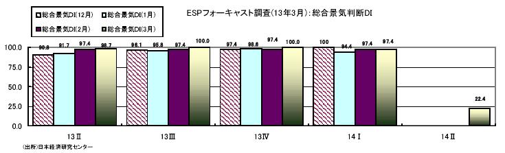「ESP フォーキャスト調査」ではエコノミストの景況感の総意をみることも可能だ。総合景気判断DI を3 月調査で見ると、13 年4~6 月期は景気判断の分岐点50 を大きく上回る98.7 となった後、7~9 月期には全員が景気は良いと判断する100.0 になり、10~12 月期も100.0、さらに14 年1~3 月期97.4 と高水準が続く。ほとんどのエコノミストが13 年度の景気を上向きとみていることがわかる。しかし、消費税引き上げが予定されている14 年4~6 月期には22.4 まで一気に落ち込むという見通しになっている。