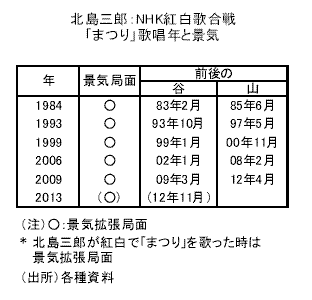 年末年始の身近なデータも景気の底堅さを示唆するものが多かった。NHK 紅白歌合戦を卒業する北島三郎が大トリで「まつり」を歌い瞬間最高視聴率50.7%を記録した。過去、北島三郎が紅白で「まつり」を歌った時、景気は拡張局面だった。今回も景気拡張局面を裏付けよう。箱根駅伝の復路のテレビ視聴率も景気拡張局面を示唆するものとして挙げられよう。今年は27.0%で04 年の26.6%以来10 年ぶりの低水準になった。過去20 年間の平均よりも1.1%低い。1 月3 日に外出している人が増えたとみられる。百貨店の初売りが好調だったことと符号する。