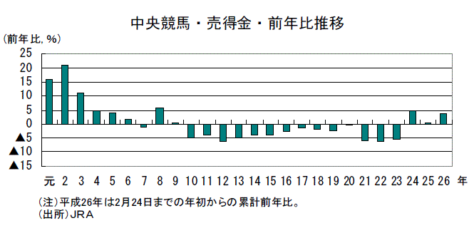 2 月12 日に発売された嵐の最新のシングルCD の「Bittersweet」は最初の1 週間の売上である初動売上枚数が51.1 万枚と景気局面の分岐点と言える初動50 万枚を超える売上になり、景気の良さを示唆した。さらに2 月26 日にはAKB48の「前しか向かねえ」が発売された。初動売上枚数の発表は3 月に入ってからになるが、初日売上が97 万枚ということで、こちらも景気局面の分岐点と言える初動50 万枚を超えた。2 月24 日までの週の中央競馬の売上(売得金)は年初からの累計の前年比は+3.5%である。今のところ今年は20 年ぶりの3 年連続プラスの伸び率になる可能性が高い。大相撲の元横綱として初のプロレスメジャー団体のシングルチャンピオンとなった曙は、K-1 時代の姿との比較で日本企業復活のシンボル的存在である。2 月23 日沖縄ではじめて開催された三冠ヘビー選手権試合で潮崎豪を破り、3 度目の防衛を果たした。日本企業復活という流れが続いていることを示唆している現象と言えよう。