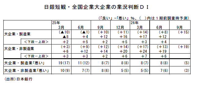 こちらも7月1日に発表された6月調査日銀短観は、大企業・製造業の業況判断DIが3月調査の+17から5ポイント悪化し+12になった。6期ぶりの悪化だが、5期連続「良い」超を意味するプラスである。消費増税前の駆け込み需要の反動減などが、企業景況感の悪化に作用したと言えそうだ。しかし、6月調査の大企業・製造業の業況判断DI+12は3月調査の「先行き」見通し+8を4ポイント上回る数字になった。一時的落ち込みに関する事前予想より足元の景況感が良かったということになり、景気は基調的には上向き局面にあることを裏付ける数字であろう。大企業・製造業で「悪い」と答えた割合は6月調査では8%と3月調査と同じだった。大企業・製造業の「先行き」業況判断DIをみると、+15と「最近」の+12より3ポイントの改善が見込まれている。