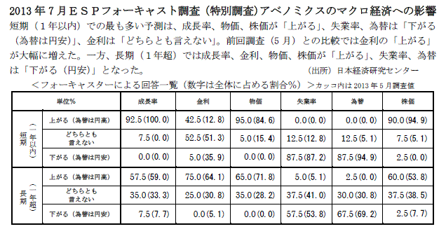 「ESPフォーキャスト調査」13年7月の特別調査で、アベノミクスの短期と長期の効果についてオールジャパンのエコノミストの意見を調べたことがある。1年以内の短期では、金融政策・財政政策の効果で、成長率の押し上げ、物価上昇、失業率改善、円安、株高になるといった見方が約9割以上でコンセンサスとなっていた。