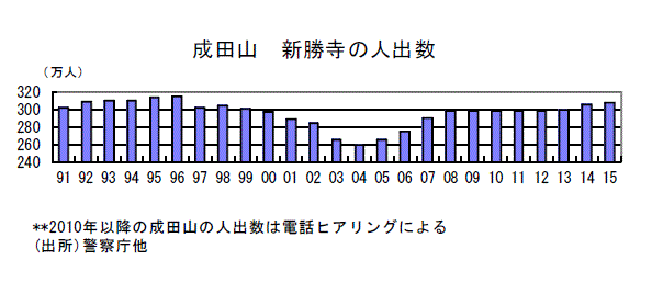 今年の正月三が日の「成田山新勝寺」の初詣参拝者は308 万人で前年より3 万人増え、96 年の315 万人以来の多さとなった。バブル崩壊により91 年から96 年までの5 年間、成田山新勝寺の初詣参拝者は概ね増加傾向だった。「苦しい時の神頼み」をした人が多かったのだろう。その後、02 年の1 月を谷とする「いざなみ景気」の拡張局面では「何とかなった」という安心感から概ね300 万人を下回る状況が続くが、07 年の姉歯事件、08 年のリーマン・ショックが景気を直撃した時期を境に、再び参拝客は増えて300 万人近くになった。なお、14 年までは参拝者数はほとんど横ばいで、300 万人前後で推移しているが、これには若い世代を中心に、「パワースポット」が流行り始めた影響があるとみられる。15 年の308 万人への増加はこの流れに加えて、足もとの景気不透明感が重なっているものと思われる。