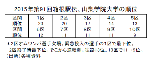 青山学院大学の初優勝となった箱根駅伝では、山梨学院大学で大逆転でのシード権獲得が話題になった。14 年は2 区でオムワンバ選手が棄権し、予選会からの出場となった15 年はまたも厳しい展開となった。2 区を走る予定だったオムワンバ選手が欠場となり1区緊急投入の田代選手が区間最下位、2 区に入った選手も厳しい結果で、2 区終了時では最下位であった。しかしその後は盛り返し、7~9 区で11 位、10 区の選手が区間3 位の快走で9 位になり10 位までに与えられるシード権を逆転で獲得した。