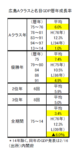 広島がセ・リーグで初優勝した1975 年以降2013 年までの名目GDP成長率と広島の成績を見ると、広島の活躍がデフレ脱却につながるように見える。広島がAクラスになった20 回分の名目成長率の平均は+6.0%で、最低は94 年の+1.0%だ。75年から13 年までの全期間での平均は+3.4%、最低は▲6.0%で、大きく差がある。広島の優勝年の6 回の平均の名目成長率は+7.4%、2 位の年6 回の平均は+5.9%、3 位の年8 回の平均は+5.0%である。