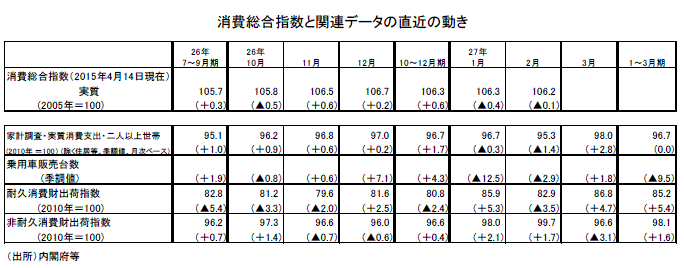 GDP の約6 割のウエイトがある個人消費は弱い。昨年GDP が2 四半期連続マイナス成長になったことなどで、人々のマインドが一時下振れたことが大きいと考えられよう。GDP の実質個人消費の類似指標である1~2 月分の消費総合指数が10~12 月分の平均に対しほぼ横ばいにとどまっているからだ。3 月分消費総合指数の前月比が、そこそこの伸び率になっても、過去の数字のリバイスがなければ1~3 月期のGDP の実質個人消費は前期比+0.2%程度と小幅の伸びにとどまりそうだ。但し、需要サイドの3 月分の個人消費データはしっかりしているので、個人消費の4~6 月期へのゲタは高めになりそうだ。