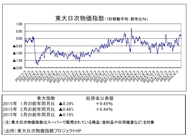 直近になって物価が上昇基調を強めているデータがある。天候不順で生鮮野菜の値段が上がったこともあるが、東大日次物価指数の7 日移動平均が4 月11 日以降直近29 日分まで19 日間、前年比プラスで推移している。直近の4 月29 日は0.4413%だ。これは、便乗値上げが実施されているのかもしれないと騒がれた昨年4 月3 日~24 日の22 日間以来の長いプラス継続である。また、5 月1 日発表の全国消費者物価指数・生鮮食品を除く総合の前年同月比は、3 月分では+2.2%に伸び率を高めた。4 月分の東京都区部・消費者物価指数・生鮮食品を除く総合の前年同月比は、消費税引き上げの影響がほぼ一巡した4 月分でも+0.4%とプラスの伸び率をキープした。雇用環境の改善は人件費の影響を受けやすいサービス価格に影響しているようだ。企業向けサービス価格指数の前年同月比は消費税率が引き上げられた昨年4 月分以降、直近の2 月分まで+3%台で推移している。