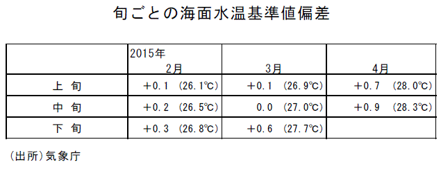 2 月・3 月のエルニーニョ監視指数はどちらも+0.2℃であった。しかし旬のデータでみると、もうかなりエルニーニョ現象になりそうな気配である。3 月中旬の監視指数は0.0℃だったが、3 月下旬に+0.6℃と一気に上昇し、4 月上旬+0.7℃、4 月中旬+0.9℃と上昇傾向にある。今年は東京と大阪の桜の開花日の差が3 日で平年の2 日を上回ったため、冷夏になっても不思議はない。夏場の天候と消費への影響が懸念される。