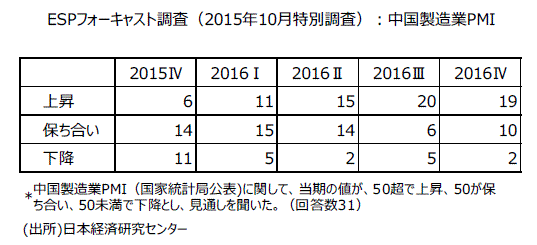 ESP フォーキャスト調査10 月特別調査:16 年に中国・製造業PMI50 を上回るとの見方先行きほど強まる