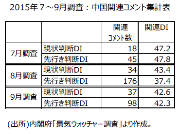 9 月調査の「景気ウォッチャー調査」では、現状判断DIは前月比低下、2 カ月連続景気判断の目安となる50 を下回った。中国の景気減速などが悪影響になっている。現状判断での「中国」関連のコメントは8 月では34 人、9 月では37 人とやや増加。中国関連の現状判断DIをつくると、8 月43.4、9 月42.6 とやや低下傾向にある。但し、全体からの乖離は各々5.9 ポイント、4.9 ポイント低い1 桁にとどまっている。現状判断での「株価」関連のコメントは8 月では33 人、9 月では27 人と、世界同時株安発生直後の調査だった8 月に比べると9月はやや落ち着いた。株価関連DIをつくると、8 月32.7 で全体からの乖離は16.6 ポイントの2 桁マイナスだった。9 月は40.8 とやや持ち直し全体からの乖離は6.7 ポイントマイナスと1 桁にとどまった。悪化度合いが拡大している感じはない。