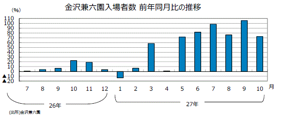訪日外国人旅行者数増加が続いている。1~9 月の前年比+48.8%で昨年の数字を伸ばすと1995.9 万人に。中国人の前年比が7月+105.1%、8 月+133.1%、9 月分+99.6%と振幅はあるが相当高い伸び率だ。金沢兼六園入園者数の前年同月比は7 月分+98.1%、8 月分+76.0%、9 月分+105.5%、10 月分+72.4%と高い伸び率が続いている。