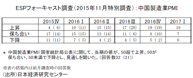 ESP フォーキャスト調査特別調査は11 月でも、16 年中国製造業PMI 年改善見込み
