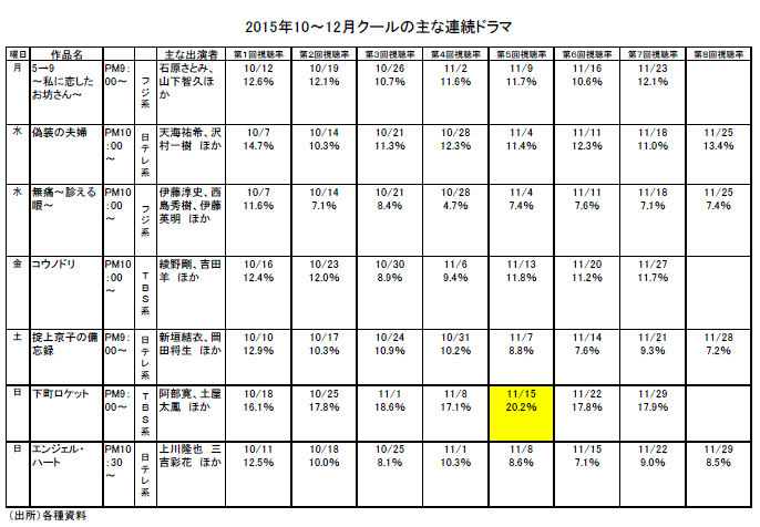 10~12 月期の連続ドラマで視聴率が初めて20%を超えたのは11 月15 日放送の「下町ロケット」だ。素晴らしい技術を持った中小企業の部品を使った純国産ロケットの打ち上げが成功した回だ。様々な困難を乗り越えた中小企業にエールを送りながらテレビを見た視聴者が多かったことだろう。