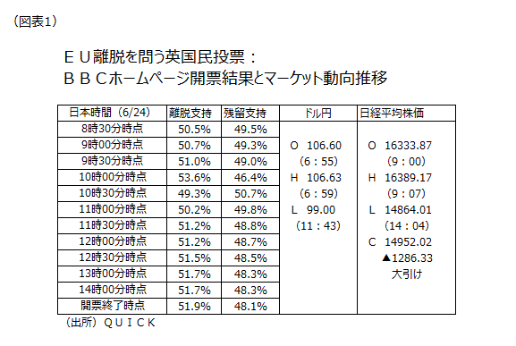 為替変動の1円超の変動日となった回数を数え、東京市場・ニューヨーク市場震源地分析をしてみると、1~3月期は日本株の投資家の外国人比率が高いこともあってニューヨーク市場発のリスクオフの円高の動きが顕著だったが、4~6月期は日銀の金融政策に絡んだ東京市場発によるものが多い。6月中の東京市場発の1円超の円高は、日銀金融政策決定会合で市場の一部で期待された金融緩和が仏滅のジンクス通り実施されなかった16日と、英国国民投票でEU離脱が決まった24日の2回だ。前日の6月23日では東京市場が終わってニューヨーク市場が始まる間に残留見通しから1円超の円安になっていた。6月24日の日本時間の午前中の値幅は7円超で、国民投票開票の結果が予想外の離脱派多数になったため、106円台後半~99円台と乱高下の展開となった(図表1)。半日で昨年の年間変動幅10円の3/4も動いた。