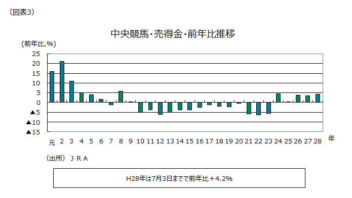 なお、5月18日発売の『99.9』の主題歌『Daylight』がダブルA面の『I seek/Daylight』の嵐の初動売上(発売最初の一週間)は73万枚と50万枚という景気判断の分岐点を上回った。また、指原莉乃が243011(下から読むと「1位をさっしーに」)票で初の2連覇となったAKB総選挙。その投票券がついた6月1日発売の『翼はいらない』は初動144万枚だった。嵐ファン、AKB48ファンの財布の紐は締っていないようだ。中央競馬の売得金の年初からの累計前年比は7月3日までで+4.2%と今年最高の伸び率となった(図表3)。一方、他の身近なデータでは司会者交代という特殊要因があるためか、4~6月期の「笑点」の視聴率が「その他娯楽番組」の1位になる週が8回もあった。実質GDPがマイナス成長だった13年10~12月期以来の多さである。日曜の夕方買い物やレジャーを控え、日曜夕方にテレビを見ている消費者は増えたかもしれない点は要注意だ。