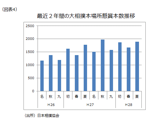 なお、「中日」が球団80周年記念事業の一環として、大相撲名古屋場所で、懸賞旗を掲示することを発表した。取組は、中入り後の8番目を予定し、1日1本15日間、計15本だ。プロ野球球団初の懸賞として話題になっている。大相撲の懸賞は地方場所では3月の大阪場所の1672本まで史上最多更新が約2年続いている。7月10日からの名古屋場所でも記録更新なるかが注目される(図表4)。