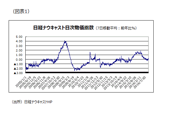 しかし、消費者物価指数以外の物価指数にこのところ変化の兆しが見られるようになってきた。まず、9月分の日銀国際商品指数前年同月比が2年3カ月ぶりにプラスに転じ、10月分・11月分では2ケタの上昇率になった。レギュラーガソリンは11月7日に126.5円と昨年12月7日(127.8円)以来の高値をつけた。国内の商品指数も上昇傾向で、日経商品指数17種11月分は前年同月比+6.5%と14年11月の+1.8%以来の2年ぶりの上昇になった。日経ナウキャスト日次物価指数は最近どうやら底打ちした兆しがある(図表1)。