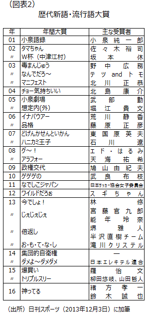 今年の流行語年間大賞は「神ってる」に決まった(図表2)。広島の鈴木誠也外野手が6月に2試合連続サヨナラ弾を放ち、緒方孝一監督が「今どきの言葉で言うなら、神ってる」と讃えたことから流行った言葉だ。広島の活躍を彷彿とさせる今年の流行語年間大賞だ。