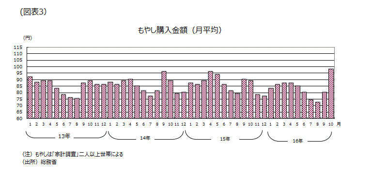 7~9月期実質GDPは第一次速報値で前期比年率+2.2%と3年ぶりに3四半期連続増加。名目GDPはリーマンショック前の08年4~6月期に並ぶ506兆円に戻った。但し、7~9月期は個人消費が前期比ほぼ横ばいといまいちであった。今年は8月に4個、9月に2個合計6個と観測史上ワースト2位の多さとなった台風上陸の影響が大きいようだ。なお、台風で生鮮野菜が値上がりしたことで消費者が生活防衛に急遽走ったことは家計調査のもやしの一世帯あたり一カ月のもやしの購入金額に表れている。もやしは栄養価が高く比較的安い野菜だからだ。二人以上世帯でみると、今年の夏16年8月は72円で近年最低だったにもかかわらず、16年10月には98円まで上昇、12年4月の101円以来の高水準を記録した(図表3)。天候の落ち着きとともに個人消費の持ち直しも期待されるところだ。