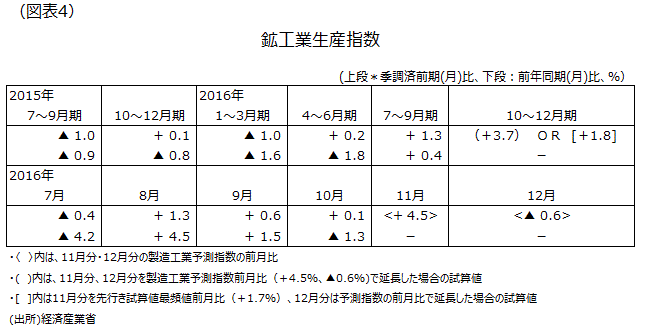 鉱工業生産指数の基調判断を見ると、15年5~7月が「一進一退」、15年8月は「弱含み」に下方修正されたが、15年9月~16年5月まで「一進一退」に戻し、16年6月には「一進一退だが、一部に持ち直し」と若干、上方修正された。そして、16年8月分~10月分で「緩やかな持ち直し」になった。在庫調整が進展し、意図せざる在庫減少局面に入ったことが大きいとみられる。16年10~12月期は3四半期連続増加が予測される(図表4)。