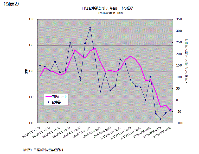 15年10月後半では「円安」の記事の方が176件多くなった。11月18日に1ドル=123円台の円安を記録した。その後は相対的に円高の記事が多くなる傾向にあった。16年1月前半では円安の記事の方がわずか1件多いにとどまった。1月後半では102件と円安の記事が一時的に増えたが、2月前半には59件、円高の記事が多くなる。その動きを反映し、2月後半からのドル円レートの期間平均が110円台前半になる。2月後半は82件、3月前半は56件、3月後半は42件と円高の記事がその後も多い状況が続いているが、数字は小さくなっているので円高基調ながらも110円を超えて円高方向へ向かうような加速感はないような感じである(図表2)。