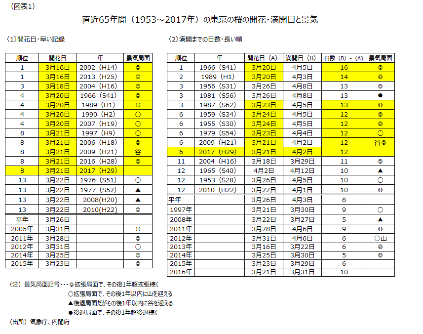 4月のトピック「東京の桜の早い開花と、開花から満開までの長さが、経済統計とともに、景気拡張局面を示唆」