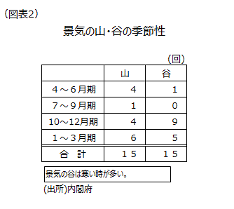 桜の開花のデータは気象庁「生物観測調査」が実施されるようになった1953年から存在する。3月21日の開花は8位タイである(図表1)。3月21日以前に開花した12回では一度も景気後退局面に当たったことがない。桜が早く咲くのは早く暖かくなっているということを意味し、春物などの商品が買われやすい。また、四季のある日本では、桜が咲くことで厳しい寒さの冬が終わり春の訪れを感じることで、マインド面で明るくなるだろう。不思議なことに、日本の戦後の景気の谷は15回あるが、そのうち年度の後半に谷があるのが14回もある(図表2)。新年を迎えること、あるいは新年度を迎えることは、気分を新たに頑張ろうとする元気が出るきっかけになるのであろう。