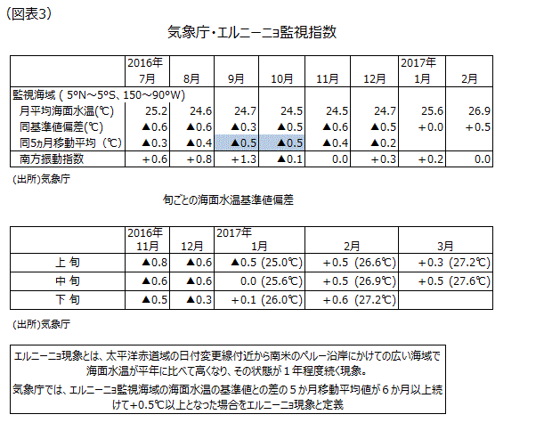 気象庁が発表しているエルニーニョ監視速報では3月10日に「エルニーニョ現象もラニーニャ現象も発生していない平常の状態が続いている。春から夏にかけてエルニーニョ現象が発生する可能性もある(40%)が、平常の状態が続く可能性の方が高い(60%)」と発表した。エルニーニョ監視指数の基準値偏差は2月分で+0.5℃になったが、3月上旬に+0.3℃と一時落ち着いた。しかし3月中旬では+0.5℃に戻った(図表3)。エルニーニョ現象が夏に発生すると冷夏になりやすく、夏物消費などにマイナスの影響を及ぼすことが多い。