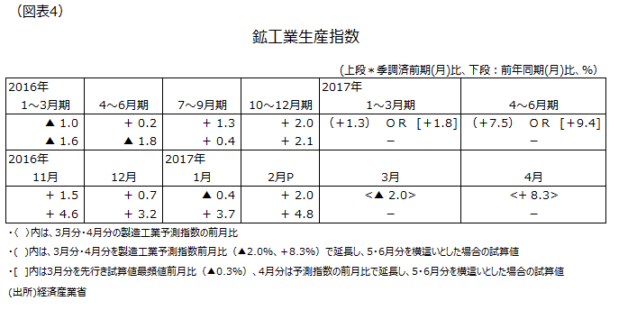 先行きの鉱工業生産指数3月分・4月分を製造工業予測指数前月比(▲2.0%、+8.3%)で延長し、5・6月分を横這いとした場合、1~3月期の前期比は+1.3%の増加に、4~6月期の前期比は+7.5%の増加になる見込みだ。一方、3月分を先行き試算値最頻値前月比(▲0.3%)、4月分は予測指数の前月比で延長し、5・6月分を横這いとした場合は1~3月期の前期比は+1.8%に、4~6月期の前期比は+9.4%の増加になる見込みだ。いずれのケースでも16年4~6月期から17年4~6月期にかけて前期比プラスは5四半期連続になりそうだ(図表4)。