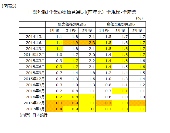 日銀短観「企業の物価見通し」の全規模・全産業ベースをみると、販売価格見通しの平均は、1年後が0.1ポイントだが上昇した。3年後と5年後は前回12月調査と同じ上昇率であった。一方、全規模・全産業ベースの物価全般の見通し平均は、1年後、3年後、5年後全てが前回12月調査と同じ上昇率になった。14年3月調査の調査開始以来全規模・全産業ベースの物価全般の見通しの予想物価上昇率は16年9月調査までは低下方向の動きしかなかった。販売価格見通しと物価全般の見通しで2期連続して全ての先行き年限で下落がない状況は14年3月調査の調査開始以来初めてだ。デフレからの脱却の動きが、企業の予想物価上昇率の下げ止まりとして現れるようになったとみられる(図表5)。